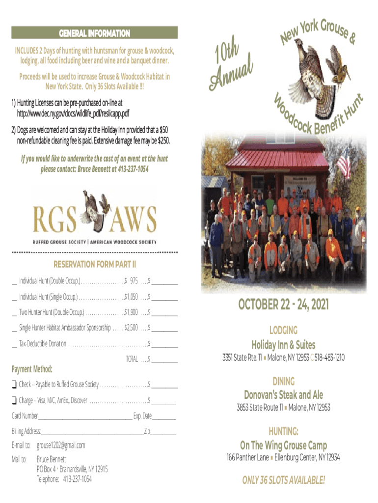 INCLUDES 2 Days of hunting with huntsman for grouse & woodcock, lodging, all food including beer and wine and a banquet dinner. Proceeds will be used to increase Grouse & Woodcock Habitat in New York