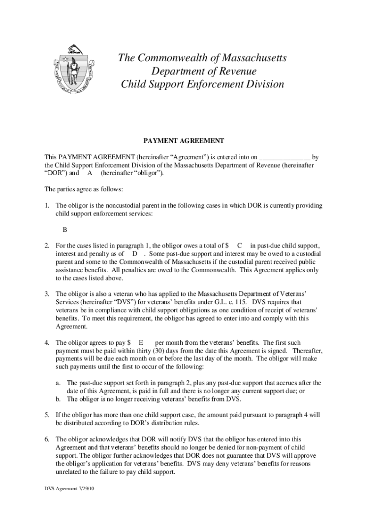 The Commonwealth of Massachusetts Department of Revenue Child Support Enforcement DivisionPAYMENT AGREEMENT This PAYMENT AGREEMENT (hereinafter Agreement) is entered into on ___ by the Child Support
