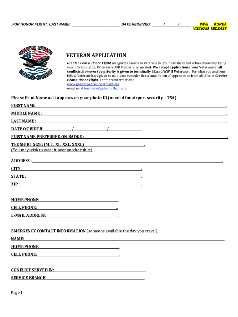 FOR HONOR FLIGHT: LAST NAME: ___ DATE RECEIVED: ___/___/___WWII KOREA VIETNAM MIDEASTVETERAN APPLICATION Greater Peoria Honor Flight recognizes American Veterans for your sacrifices and achievements