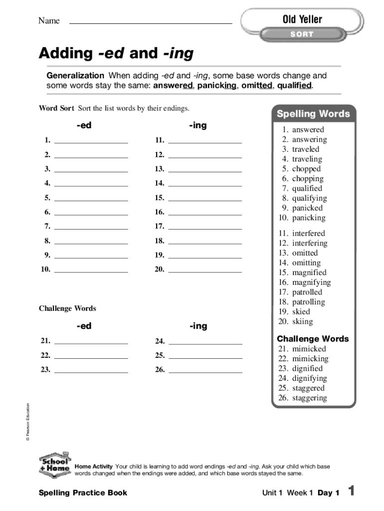 Old YellerNameSORTAdding ed and ING Generalization When adding ed and ING, some base words change and some words stay the same: answered, panicking, omitted, qualified. Word Sort the list words by