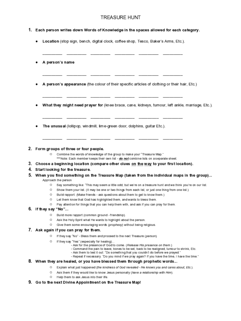 TREASURE HUNT 1. Each person writes down Words of Knowledge in the spaces allowed for each category. Location (stop sign, bench, digital clock, coffee shop, Tesco, Bakers Arms, Etc.). _______________________________________What