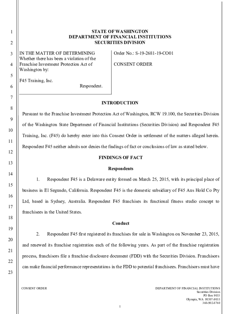 Get the free F45 Training Inc.- Consent Order - S-1-9-2681-19-CO01. F45 Training Inc.- Consent Or...