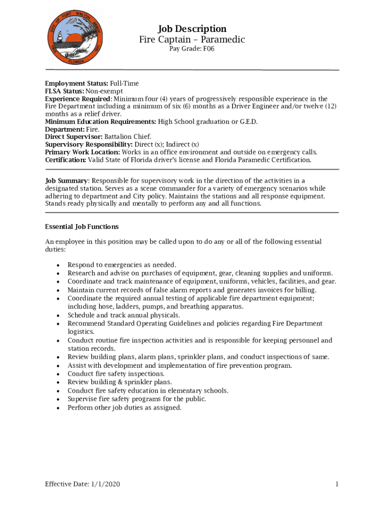 Job Description Fire Captain Paramedic Pay Grade: F06Employment Status: Halftime FLEA Status: Nonexempt Experience Required: Minimum four (4) years of progressively responsible experience in the Fire