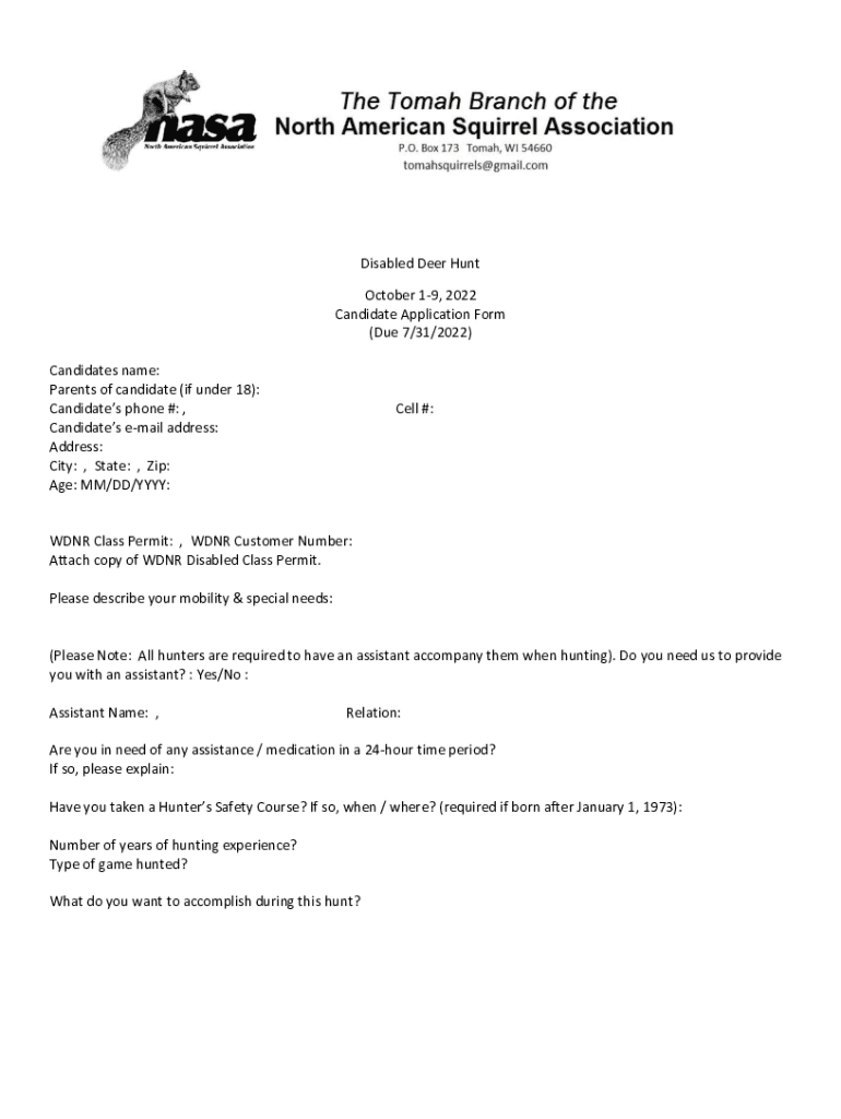 Disabled Deer Hunt October 19, 2022, Candidate Application Form (Due 7/31/2022) Candidates name: Parents of candidate (if under 18): Candidates phone #:, Candidates email address: Address: City:,