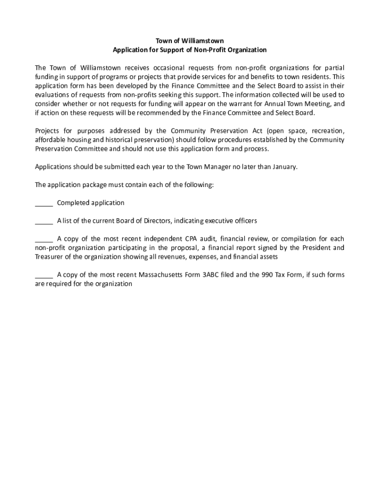 Town of Williams town Application for Support of Nonprofit Organization The Town of Williams town receives occasional requests from nonprofit organizations for partial funding in support of programs