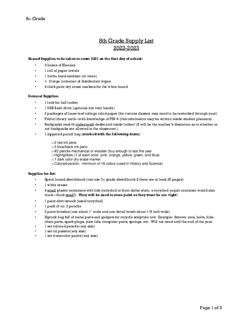 8th Grade8th Grade Supply List 20222023 Shared Supplies to be taken to room 3321 on the first day of school: 3 boxes of Kleenex 1 roll of paper towels 1 bottle hand sanitizer (or more) 1 3 large containers