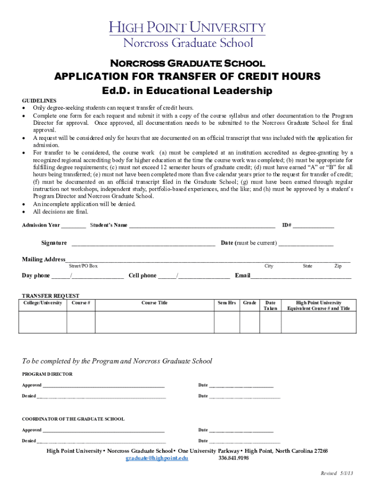 Norcross Graduate School APPLICATION FOR TRANSFER OF CREDIT HOURS Ed. D. in Educational LeadershipGUIDELINES Only degree seeking students can request transfer of credit hours. Complete one form for