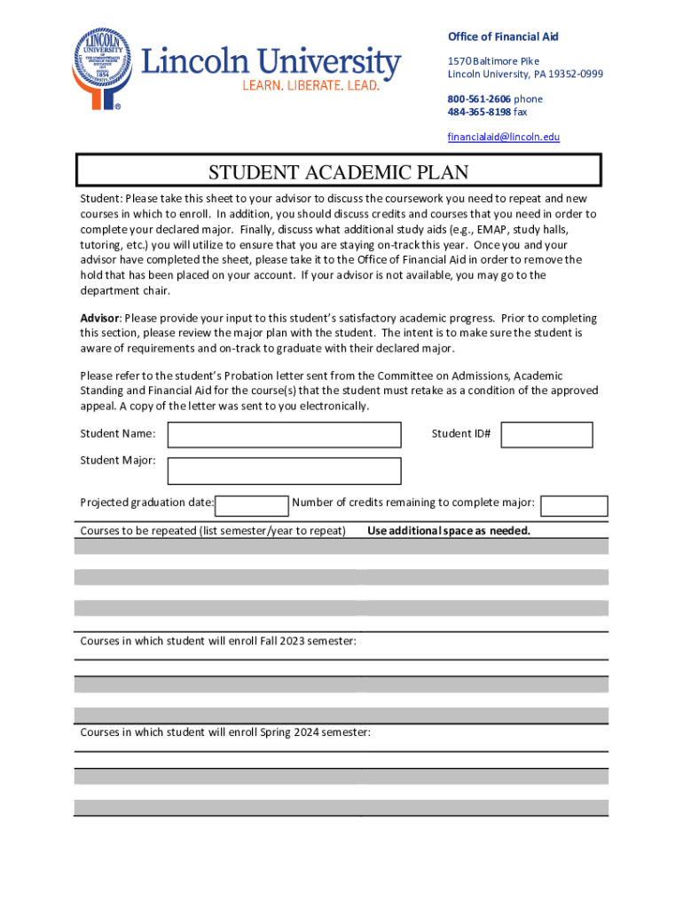 Office of Financial Aid 1570 Baltimore Pike Lincoln University, PA 193520999 8005612606 phone 4843658198 fax financialaid@lincoln.eduSTUDENT ACADEMIC PLAN Student: Please take this sheet to your advisor