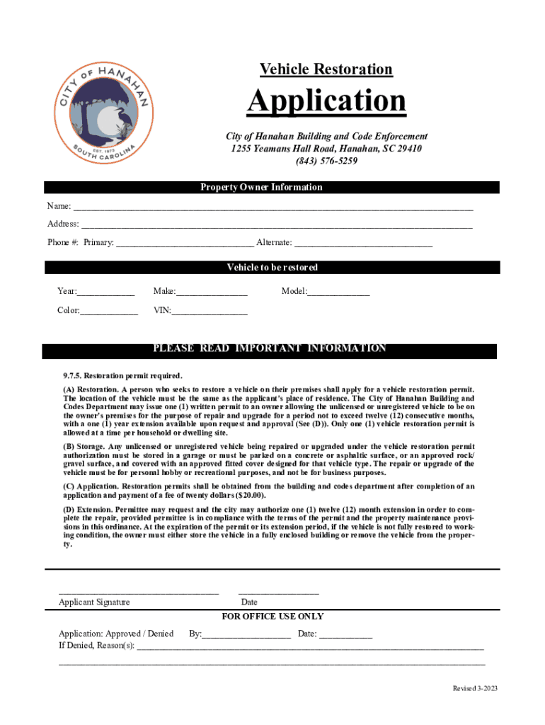 Vehicle RestorationApplication City of Shanahan Building and Code Enforcement 1255 Yea mans Hall Road, Shanahan, SC 29410 (843) 5765259 Property Owner Information Name: ___ Address: ___ Phone #: Primary: