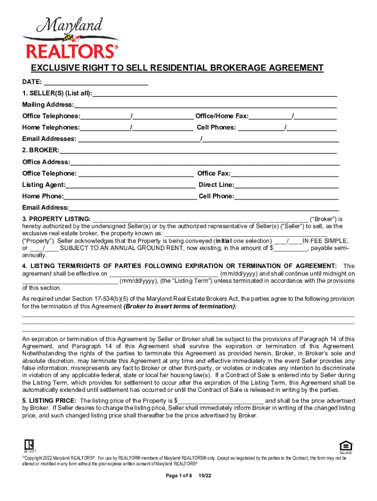 EXCLUSIVE RIGHT TO SELL RESIDENTIAL BROKERAGE AGREEMENT DATE: ___ 1. SELLER(S) (List all):___ Mailing Address:___ Office Telephones:___/___ Office/Home Fax:___/___ Home Telephones:___/___ Cell Phones: