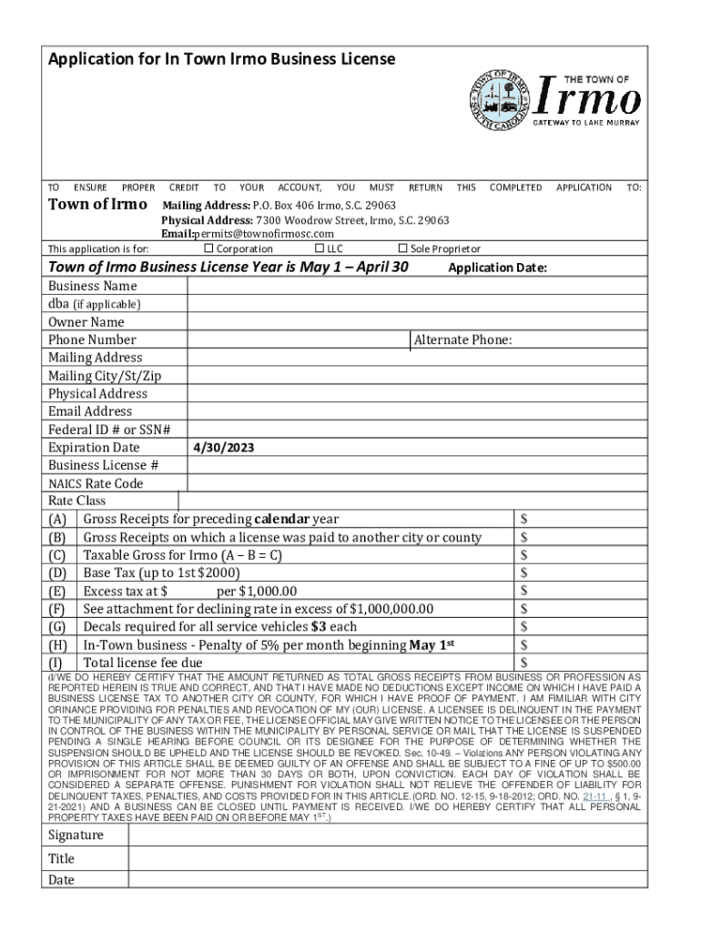 Application for In Town IMO Business LicenseTOENSUREPROPERTown of IMO This application is for:CREDITTOYOURACCOUNT, YOUMUSTRETURNTHISCOMPLETEDAPPLICATIONTO:Mailing Address: P.O. Box 406 IMO, S.C. 29063