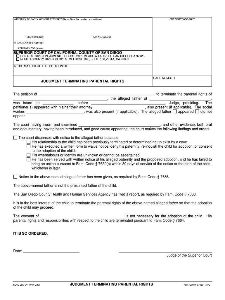 Page 1. DSC JUV-244 (New 9/12) ... SUPERIOR COURT OF CALIFORNIA, COUNTY OF SAN DIEGO. CENTRAL DIVISION, JUVENILE COURT, 2851 MEADOW LARK DR., SAN DIEGO, CA 92123. NORTH ... He has executed a written