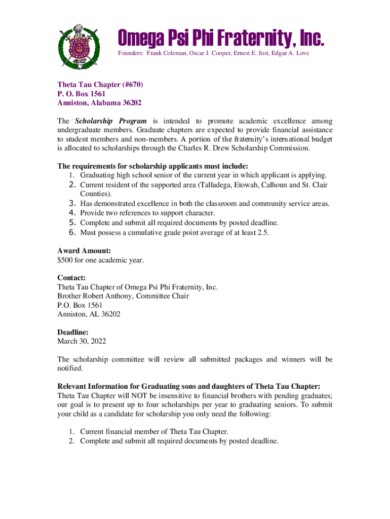 Omega Psi Phi Fraternity, Inc. Founders: Frank Coleman, Oscar J. Cooper, Ernest E. Just, Edgar A. Loretta Tau Chapter (#670) P. O. Box 1561 Anniston, Alabama 36202 The Scholarship Program is intended