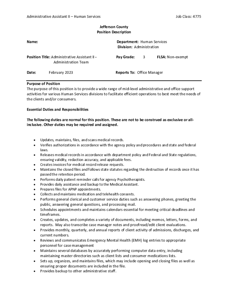 AdministrativeAssistantIIHumanServices JeffersonCounty PositionDescriptionJobClass:4775Name:Department:HumanServices Division:Admins