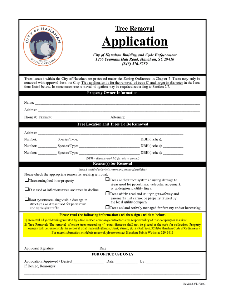 Tree RemovalApplication City of Shanahan Building and Code Enforcement 1255 Yea mans Hall Road, Shanahan, SC 29410 (843) 5765259Trees located within the City of Shanahan are protected under the Zoning