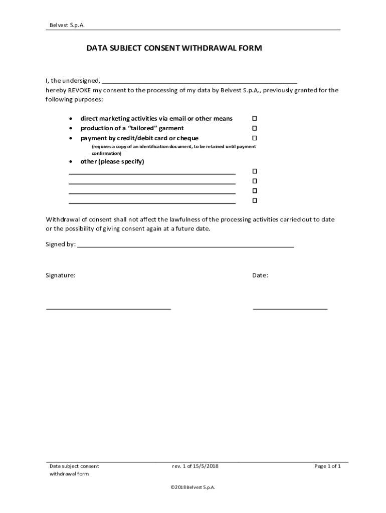 Data subject consent withdrawal can be filled out by submitting a written request to the data controller or processor.