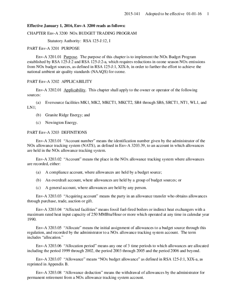 2015141Adopted to be effective 0101161Effective January 1, 2016, Envy 3200 reads as follows: CHAPTER Envy 3200 NOX BUDGET TRADING PROGRAM Statutory Authority: RSA 125J:12, I PART Envy 3201 PURPOSE