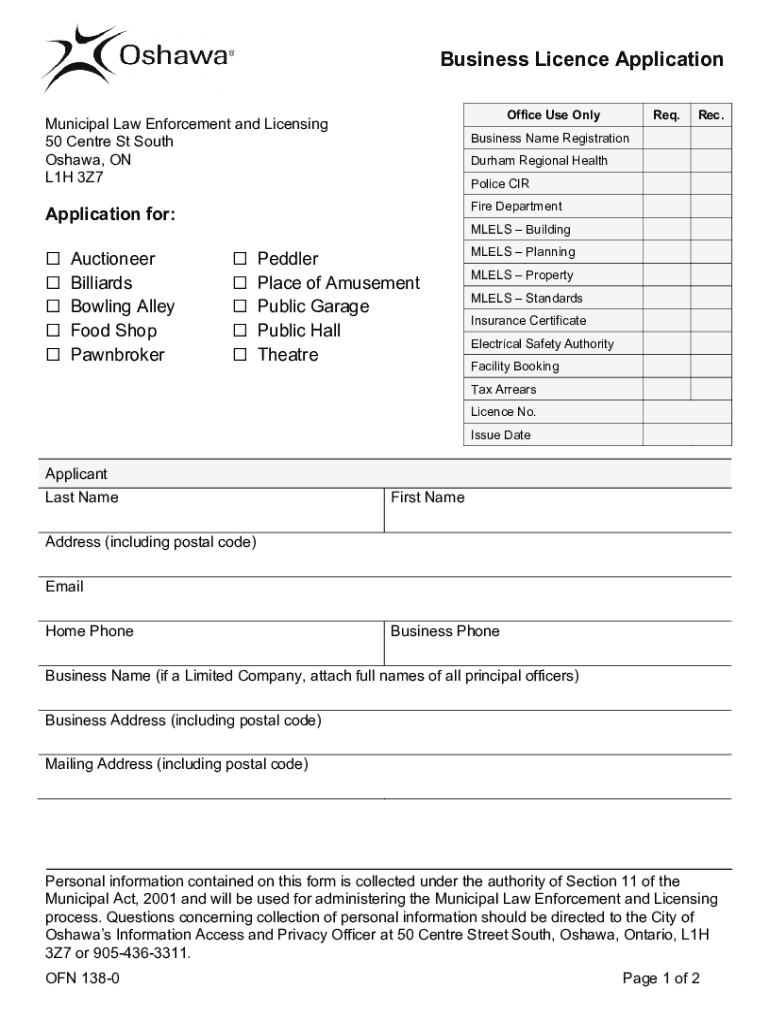 Business License Application Office Use OnlyMunicipal Law Enforcement and Licensing 50 Center St South Oshawa, ON L1H 3Z7Auctioneer Billiards Bowling Alley Food Shop Pawnbroker. Business Name Registration
