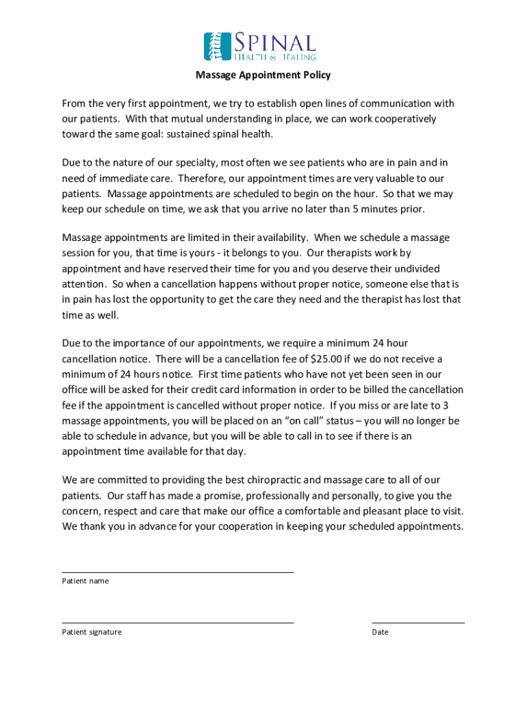 Massage Appointment Policy From the very first appointment, we try to establish open lines of communication with our patients. With that mutual understanding in place, we can work cooperatively toward