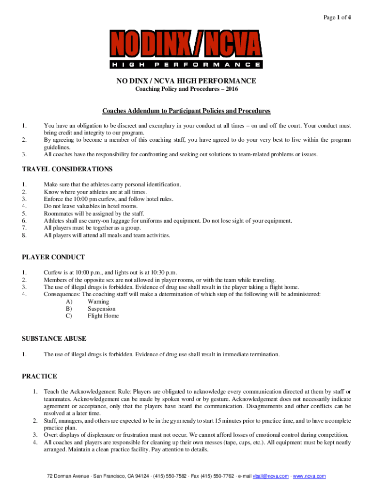 Page 1 of 4NO DIN / NCAA HIGH PERFORMANCE Coaching Policy and Procedures 2016Coaches Addendum to Participant Policies and Procedures 1. You have an obligation to be discreet and exemplary in your