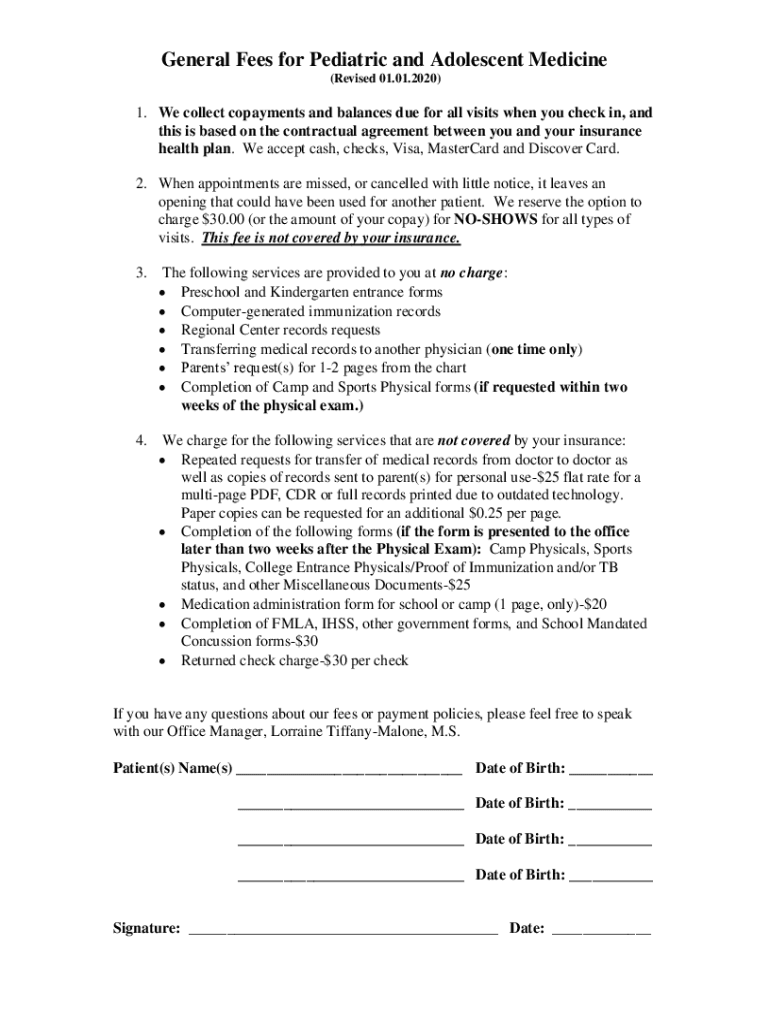 General Fees for Pediatric and Adolescent Medicine (Revised 01.01.2020)1. We collect co-payments and balances due for all visits when you check in, and this is based on the contractual agreement between