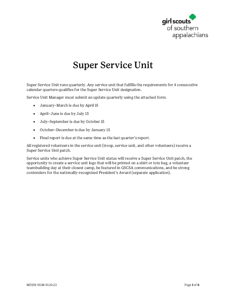 Super Service Unit Super Service Unit runs quarterly. Any service unit that fulfills the requirements for 4 consecutive calendar quarters qualifies for the Super Service Unit designation. Service