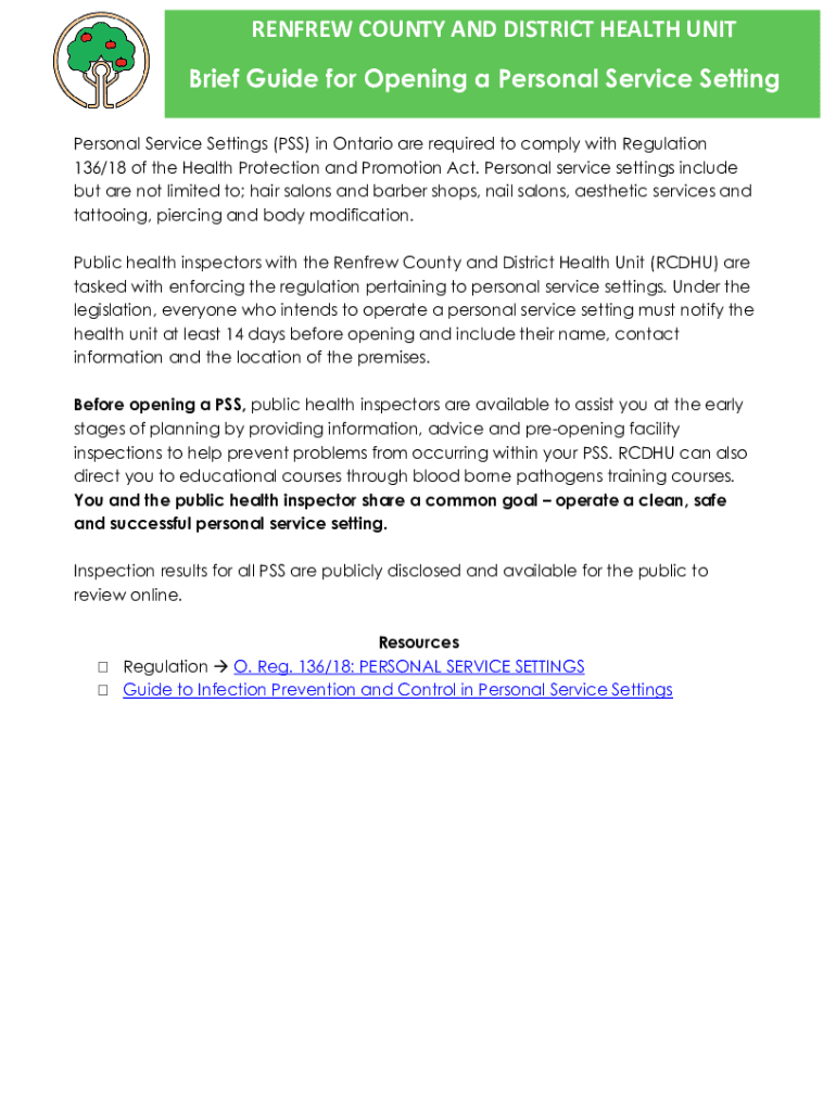 RENFREW COUNTY AND DISTRICT HEALTH UNIT Brief Guide for Opening a Personal Service Setting Personal Service Settings (PSS) in Ontario are required to comply with Regulation 136/18 of the Health Protection