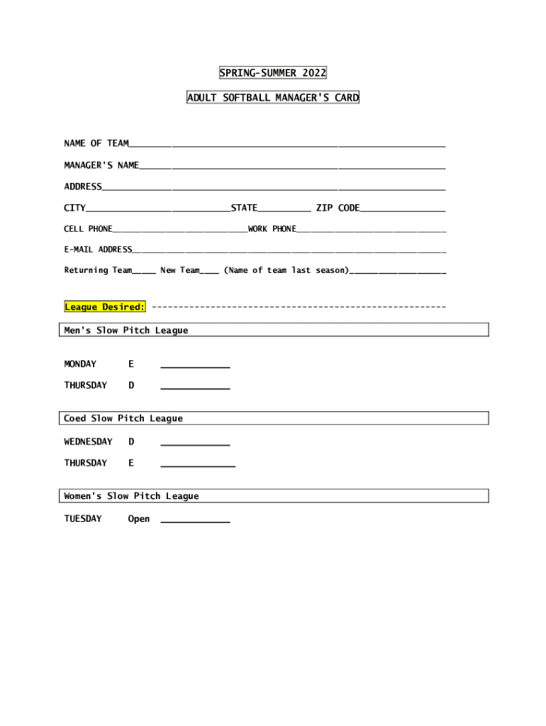 SPRINGSUMMER 2022 ADULT SOFTBALL MANAGER\'S CARNAGE OF TEAM___ MANAGER\'S NAME___ ADDRESS___ CITY___STATE___ ZIP CODE___ CELL PHONE___WORK PHONE___ EMAIL ADDRESS___ Returning Team___ New Team___ (Name