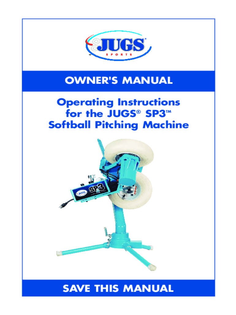 OWNER\'S MANUAL Operating Instructions for the JUGS SP3 Softball Pitching Machine SAVE THIS MANUALATTENTION: Coaches and operators of this pitching machine. This manual must be kept with the pitching