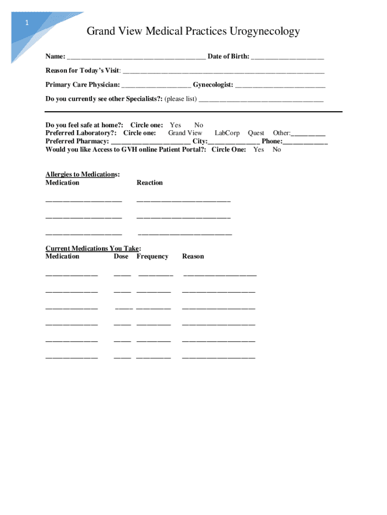 1Grand View Medical Practices Gynecology Name: ___ Date of Birth: ___ Reason for Today's Visit: ___ Primary Care Physician: ___ Gynecologist: ___ Do you currently see other Specialists?: (please list)