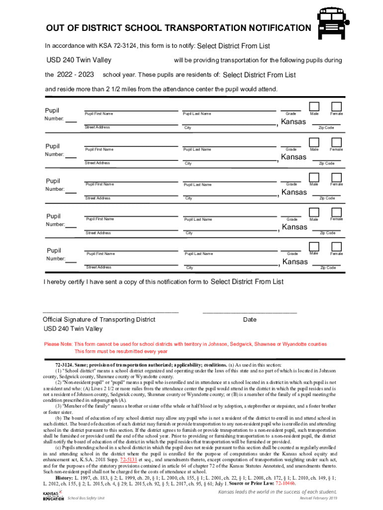 OUT OF DISTRICT SCHOOL TRANSPORTATION NOTIFICATION In accordance with KSA 723124, this form is to notify: Select District From List USD 240 Twin Valley the 2022 2023will be providing transportation