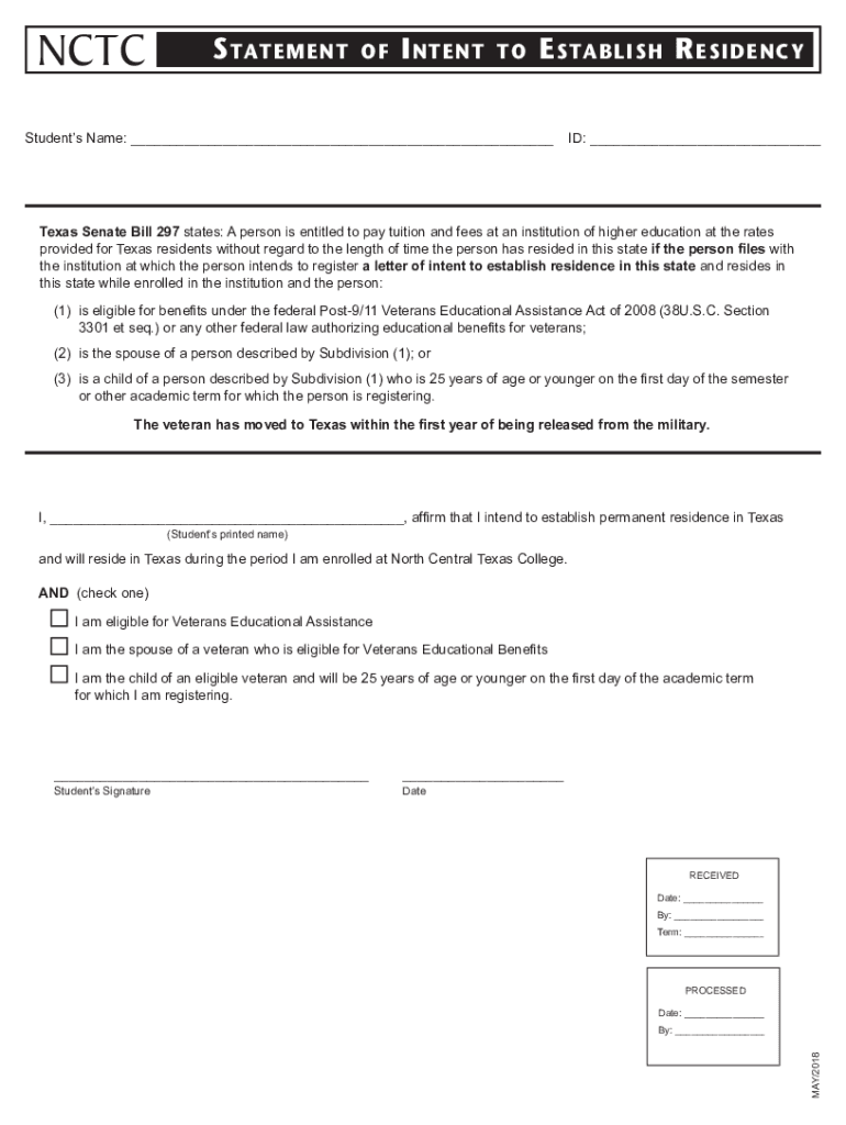 ACTS that e m e n tofIntenttoE s ta b l is h R e is d e n c students Name: ___ID: ___Texas Senate Bill 297 states: A person is entitled to pay tuition and fees at an institution of higher education