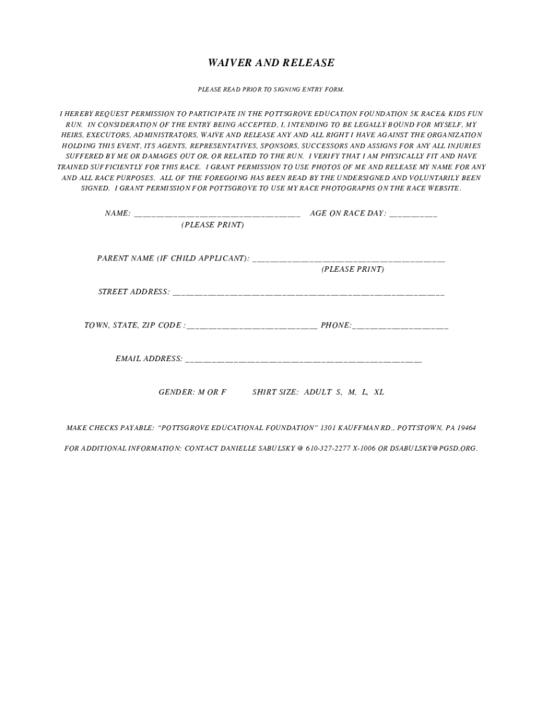 WAIVER AND RELEASEPLEASE READ PRIOR TO SIGNING ENTRY FORM. I HEREBY REQUEST PERMISSION TO PARTICIPATE IN THE COSGROVE EDUCATION FOUNDATION 5K RACE KIDS FUN RUN. IN CONSIDERATION OF THE ENTRY BEING