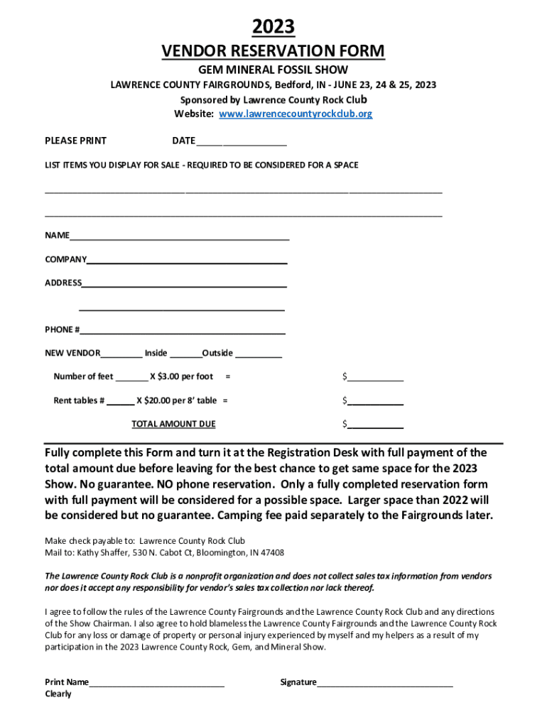 2023 VENDOR RESERVATION FORM GEM MINERAL FOSSIL SHOW LAWRENCE COUNTY FAIRGROUNDS, Bedford, On JUNE 23, 24 & 25, 2023 Sponsored by Lawrence County Rock Club Website: www.lawrencecountyrockclub.org