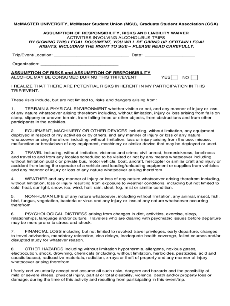 McMaster UNIVERSITY, McMaster Student Union (MSU), Graduate Student Association (GSA) ASSUMPTION OF RESPONSIBILITY, RISKS AND LIABILITY WAIVER ACTIVITIES INVOLVING ALCOHOL/BUS TRIPS BY SIGNING THIS