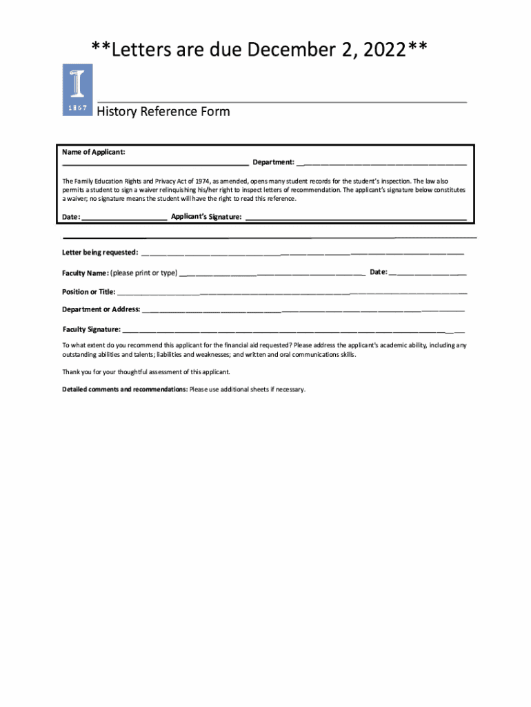 **Letters are due December 2, 2022 **History Reference Forename of Applicant: Department:___ The Family Education Rights and Privacy Act of 1974, as amended, opens many student records for the student\'s