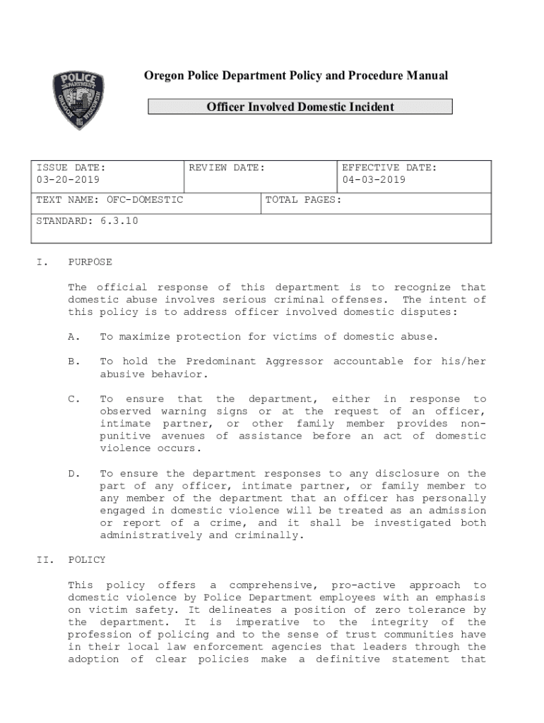 Oregon Police Department Policy and Procedure Manual Officer Involved Domestic IncidentISSUE DATE: 03202019 TEXT NAME: OFCDOMESTICREVIEW DATE:EFFECTIVE DATE: 04032019 TOTAL PAGES:STANDARD: 6.3.10