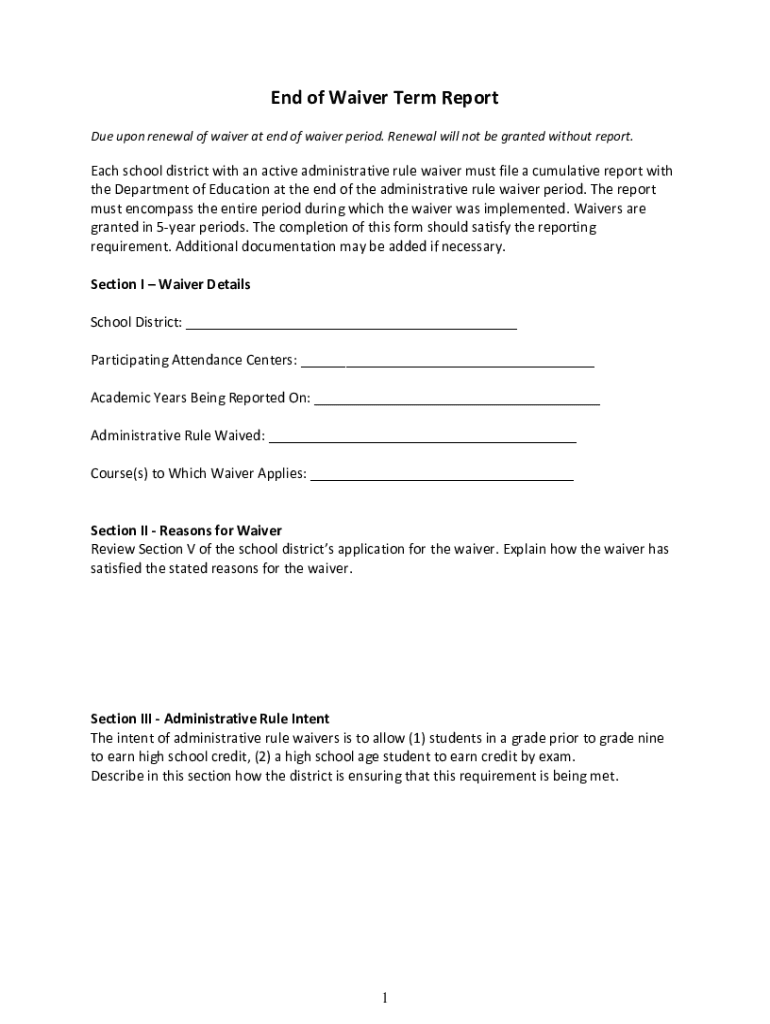 End of Waiver Term Report Due upon renewal of waiver at end of waiver period. Renewal will not be granted without report. Each school district with an active administrative rule waiver must file a