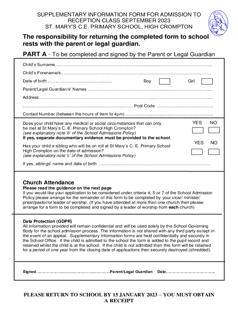 SUPPLEMENTARY INFORMATION FORM FOR ADMISSION TO RECEPTION CLASS SEPTEMBER 2023 ST. MARY C.E. PRIMARY SCHOOL, HIGH CROMPTONThe responsibility for returning the completed form to school rests with the