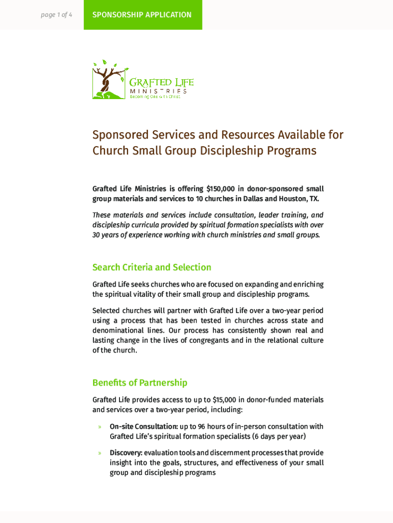 Page 1 of 4SPONSORSHIP APPLICATIONSponsored Services and Resources Available for Church Small Group Discipleship Programs Grafted Life Ministries is offering $150,000 in donor sponsored small group