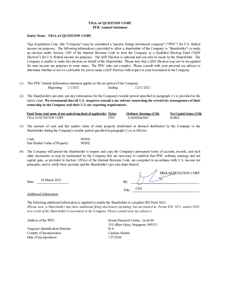 Get the free Tiga Acquisition Corp. 2021 PFIC Annual Information Statement.xlsx