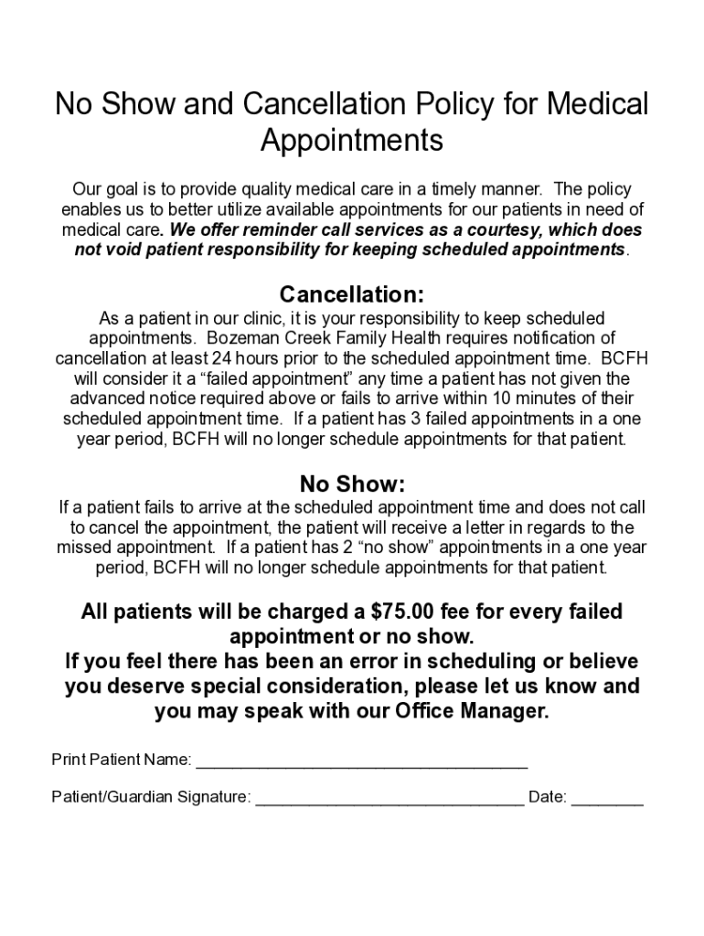 No Show and Cancellation Policy for Medical Appointments Our goal is to provide quality medical care in a timely manner. The policy enables us to better utilize available appointments for our patients