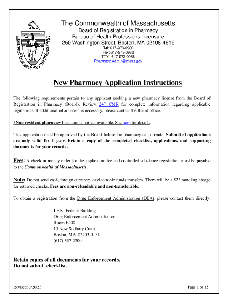 The Commonwealth of Massachusetts Board of Registration in Pharmacy Bureau of Health Professions Licensure 250 Washington Street, Boston, MA 021084619 Tel: 6179730960 Fax: 6179730980 TTY : 6179730988