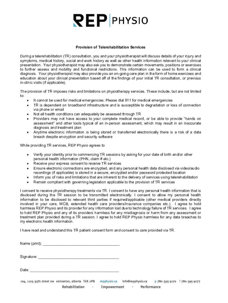 Provision of Telerehabilitation Services During a telerehabilitation (TR) consultation, you and your physiotherapist will discuss details of your injury and symptoms, medical history, social and work