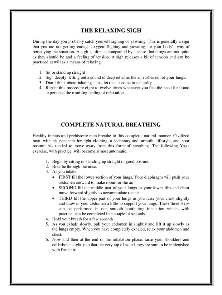 THE RELAXING SIGH During the day you probably catch yourself sighing or yawning. This is generally a sign that you are not getting enough oxygen. Sighing and yawning are your bodies of remedying the