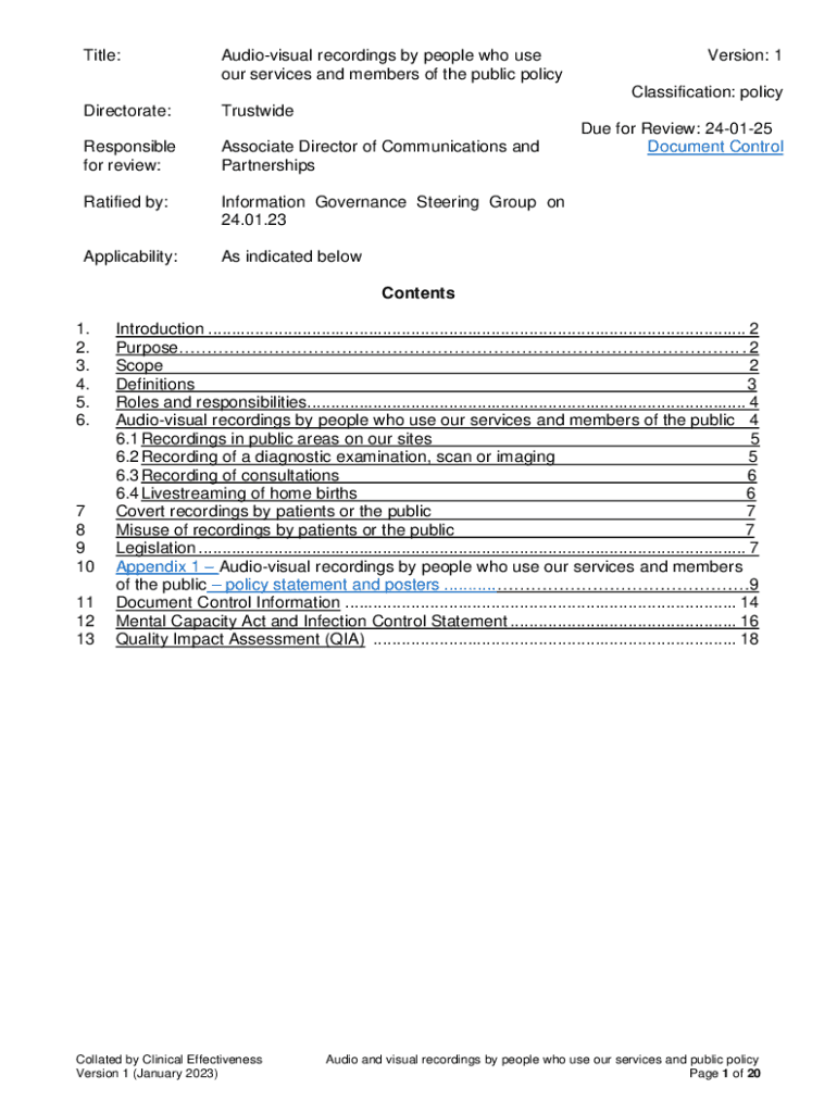 Title:Audiovisual recordings by people who use our services and members of the public policyDirectorate:TrustwideResponsible for review:Associate Director of Communications and PartnershipsRatified