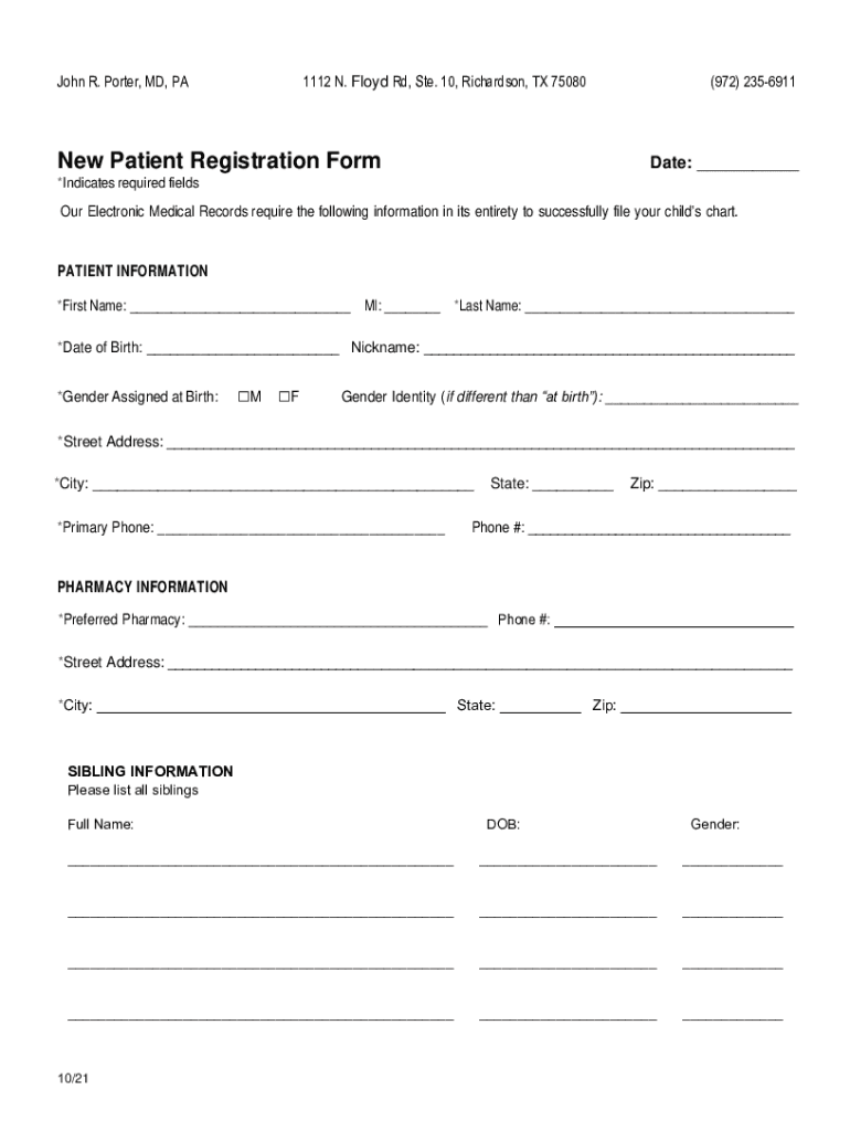 John R. Porter, MD, PA1112 N. Floyd Rd, Ste. 10, Richardson, TX 75080New Patient Registration Form(972) 2356911Date: ___*Indicates required fields Electronic Medical Records require the following