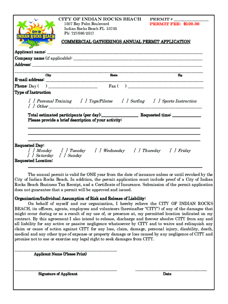 CITY OF INDIAN ROCKS BEACH 1507 Bay Palm Boulevard Indian Rocks Beach FL 33785 pH: 727/5952517Permit # ___ PERMIT FEE: $100.00COMMERCIAL GATHERINGS ANNUAL PERMIT APPLICATION Applicant name: ___ Company