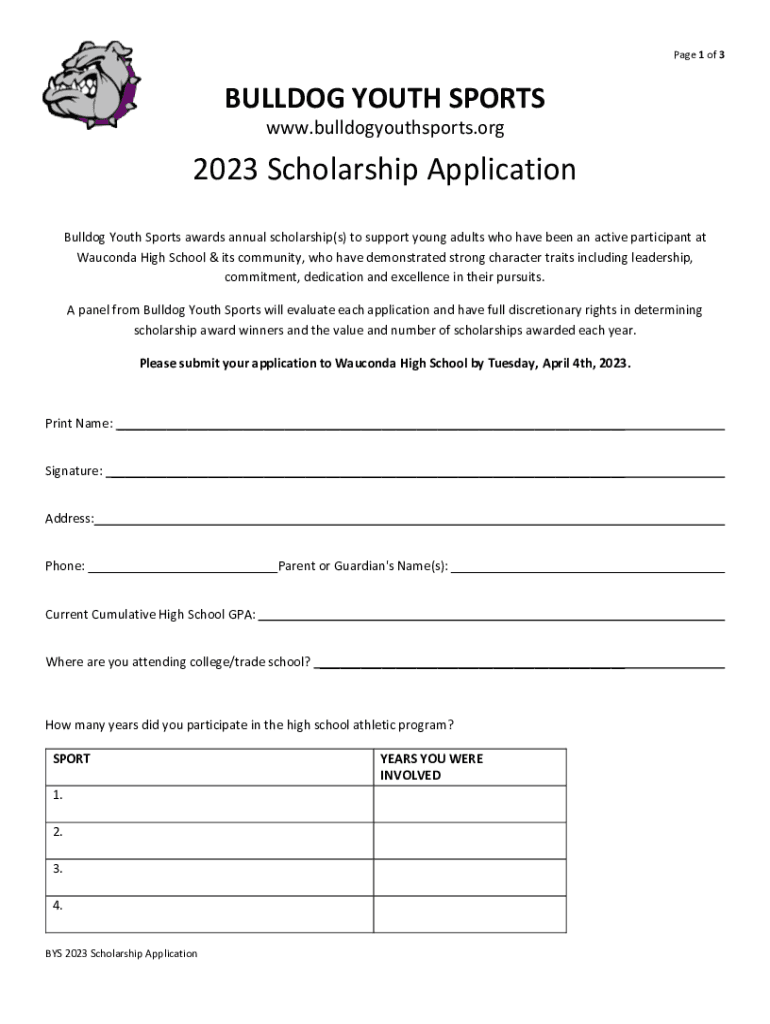 Page 1 of 3BULLDOG YOUTH SPORTS www.bulldogyouthsports.org2023 Scholarship Application Bulldog Youth Sports awards annual scholarship(s) to support young adults who have been an active participant