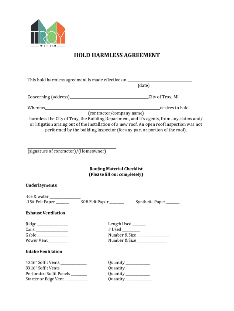 HOLD HARMLESS Agreements hold harmless agreement is made effective on: Concerning (address).(date)City of Troy, Whereas, desires to hold(contractor/company name) harmless the City of Troy, the Building